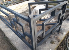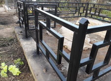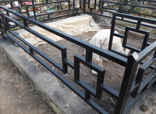 Возвращаемся на могилу. Подготавливаем оградку к покраске, зачищая её от старого покрытия. Параллельно устанавливаем подставку для памятника.