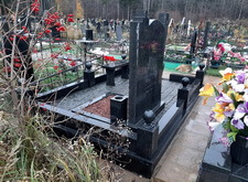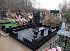 Завершающим этапом стала сборка оградки и укладка брусчатки. Ограждение мы создали из находившихся на могиле секций, кое где закрепив отломавшиеся навершия на разделительные столбики. Перед памятником мы установили гранитный цветник и две траурные урны, а по правую сторону от входа поставили заказанную клиентом лавочку, тоже изготовленную из чёрного гранита. Брусчатку мы замыли водой, одновременно удаляя всю строительную пыль, образовавшуюся в процессе работы.